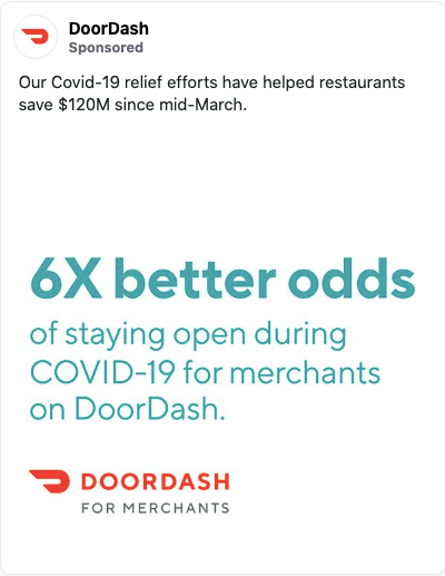 Doordash really hits on a pain point for restaurant owners in this ad–if you are afraid of closing up shop in the middle of the Covid-19 pandemic this ad is going to catch your eye. It uses a hard number with 6x — what restaurant owner wouldn’t want to have 6x better chance of keeping their restaurant open?