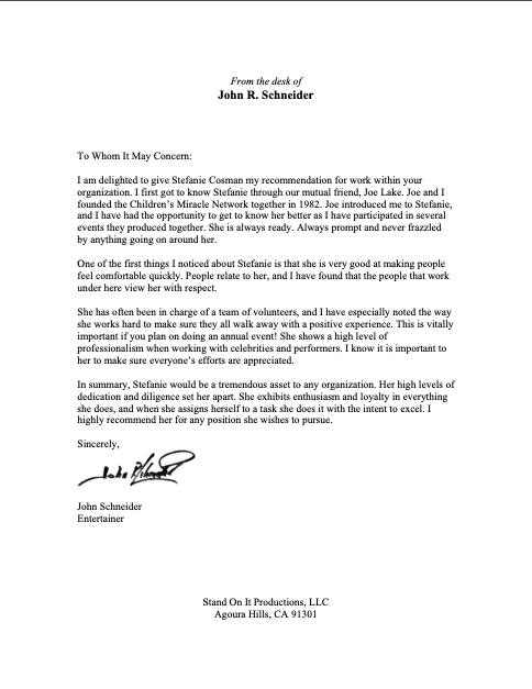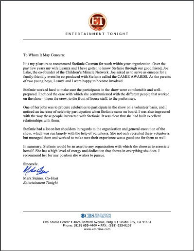 “One of her jobs was to procure celebrities to participate in the show on a volunteer basis, and I noticed an increase of celebrity participation when Stefanie came on board. I was also impressed with the way these people interacted with Stefanie. It was clear that she had built excellent