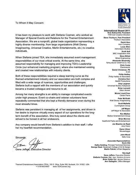 “Among her many strengths is the ability to manage complicated events under high pressure. Event co-chairs and veteran volunteers have repeatedly commented that she kept a friendly demeanor even during the most stressful times.” — Gene Jeffers, Executive Director of the Themed Entertainment Association (Retired)